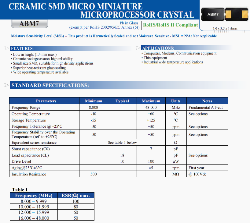 | ABM7-48.000MHZ-B-4-T | Abracon | ABM7 | 48 MHz | ±50ppm | ±30ppm | 18 pF |