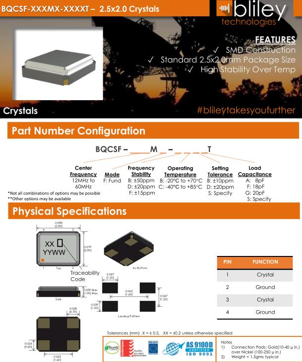 百利晶振,BQCSF晶振,BQCSF-24.000M-FDCBFT晶振,小型貼片石英晶振,外觀尺寸具有薄型表面貼片型石英晶體振蕩器,特別適用于有小型化要求的市場領(lǐng)域,比如智能手機(jī),無線藍(lán)牙,平板電腦等電子數(shù)碼產(chǎn)品.晶振本身超小型,薄型,重量輕,晶體具有優(yōu)良的耐環(huán)境特性,如耐熱性,耐沖擊性,在辦公自動(dòng)化,家電相關(guān)電器領(lǐng)域及Bluetooth,WirelessLAN等短距離無線通信領(lǐng)域可發(fā)揮優(yōu)良的電氣特性,滿足無鉛焊接的回流溫度曲線要求.Bliley Technologies Inc. 最初于 1930 年作為 Bliley Piezo-Electric Company 成立。最初,我們?yōu)闃I(yè)余無線電市場制造石英晶體。在 1930 年代中期,我們的客戶和產(chǎn)品很快擴(kuò)大到與新興的軍事和商業(yè)通信領(lǐng)域的利益相匹配,我們的名稱更名為 Bliley Electric Company。1939 年,我們是最大的水晶公司,擁有 11 名員工。