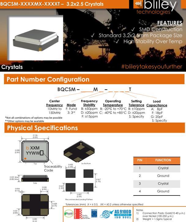 Bliley晶振,BQCSM晶振,BQCSM-20.000M-FDBBAT晶振,超小型表面貼片型SMD晶振,最適合使用在汽車電子領(lǐng)域中,也是特別要求高可靠性的引擎控制用CPU的時(shí)鐘部分.低頻晶振可從7.98MHz起對(duì)應(yīng),小型,超薄型具備強(qiáng)防焊裂性,石英晶體在極端嚴(yán)酷的環(huán)境條件下也能發(fā)揮穩(wěn)定的起振特性,產(chǎn)品本身具有耐熱,耐振,耐撞擊等優(yōu)良的耐環(huán)境特性,滿足無鉛焊接以及高溫回流溫度曲線要求,符合AEC-Q200標(biāo)準(zhǔn).Bliley Technologies Inc. 最初于 1930 年作為 Bliley Piezo-Electric Company 成立。最初,我們?yōu)闃I(yè)余無線電市場(chǎng)制造石英晶體。在 1930 年代中期,我們的客戶和產(chǎn)品很快擴(kuò)大到與新興的軍事和商業(yè)通信領(lǐng)域的利益相匹配,我們的名稱更名為 Bliley Electric Company。1939 年,我們是最大的水晶公司,擁有 11 名員工。