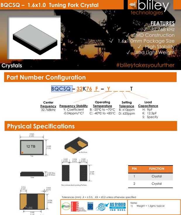 Bliley晶振,BQCSQ晶振,BQCSQ-32K76F-YBBKT晶振,貼片表晶32.768K系列具有超小型,薄型,質(zhì)地輕的表面貼片音叉型石英晶體振蕩器,晶振產(chǎn)品本身具備優(yōu)良的耐熱性,耐環(huán)境特性,在辦公自動(dòng)化,家電領(lǐng)域,移動(dòng)通信領(lǐng)域可發(fā)揮優(yōu)良的電氣特性,符合無鉛標(biāo)準(zhǔn),滿足無鉛焊接的回流溫度曲線要求,金屬外殼的石英晶振使得產(chǎn)品在封裝時(shí)能發(fā)揮比陶瓷晶振外殼更好的耐沖擊性能.Bliley Technologies Inc. 最初于 1930 年作為 Bliley Piezo-Electric Company 成立。最初,我們?yōu)闃I(yè)余無線電市場(chǎng)制造石英晶體。在 1930 年代中期,我們的客戶和產(chǎn)品很快擴(kuò)大到與新興的軍事和商業(yè)通信領(lǐng)域的利益相匹配,我們的名稱更名為 Bliley Electric Company。1939 年,我們是最大的水晶公司,擁有 11 名員工。