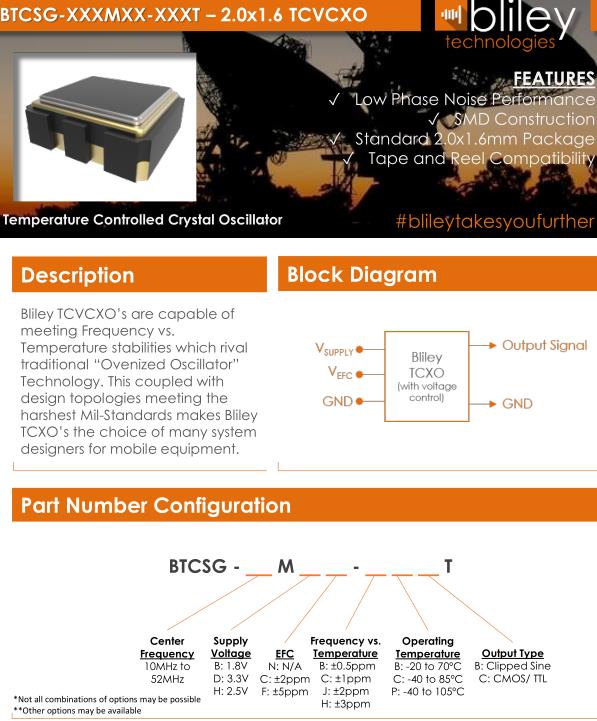Bliley晶振,BTCSG晶振,BTCSG-16.000MDF-CBBT晶振,2016mm體積的溫補(bǔ)晶振(TCXO),是目前有源晶振中體積最小的一款,產(chǎn)品本身帶溫度補(bǔ)償作用的晶體振蕩器,該體積產(chǎn)品最適合于GPS,以及衛(wèi)星通訊系統(tǒng),智能電話等多用途的高穩(wěn)定的頻率溫度特性晶振.為對(duì)應(yīng)低電源電壓的產(chǎn)品.(DC+1.8V±0.1Vto+2.9V±0.1V對(duì)應(yīng)IC可能)高度:最高0.8mm,體積:0.0022cm3,重量:0.008g,超小型,輕型,低消耗電流,表面貼片型產(chǎn)品.(可對(duì)應(yīng)回流焊)無鉛產(chǎn)品.滿足無鉛焊接的高溫回流溫度曲線要求,帶有AFC(頻率控制)功能,Enable/Disable功能,產(chǎn)品本身可根據(jù)使用需要進(jìn)行選擇.Bliley Technologies Inc. 最初于 1930 年作為 Bliley Piezo-Electric Company 成立。最初,我們?yōu)闃I(yè)余無線電市場(chǎng)制造石英晶體。在 1930 年代中期,我們的客戶和產(chǎn)品很快擴(kuò)大到與新興的軍事和商業(yè)通信領(lǐng)域的利益相匹配,我們的名稱更名為 Bliley Electric Company。1939 年,我們是最大的水晶公司,擁有 11 名員工。