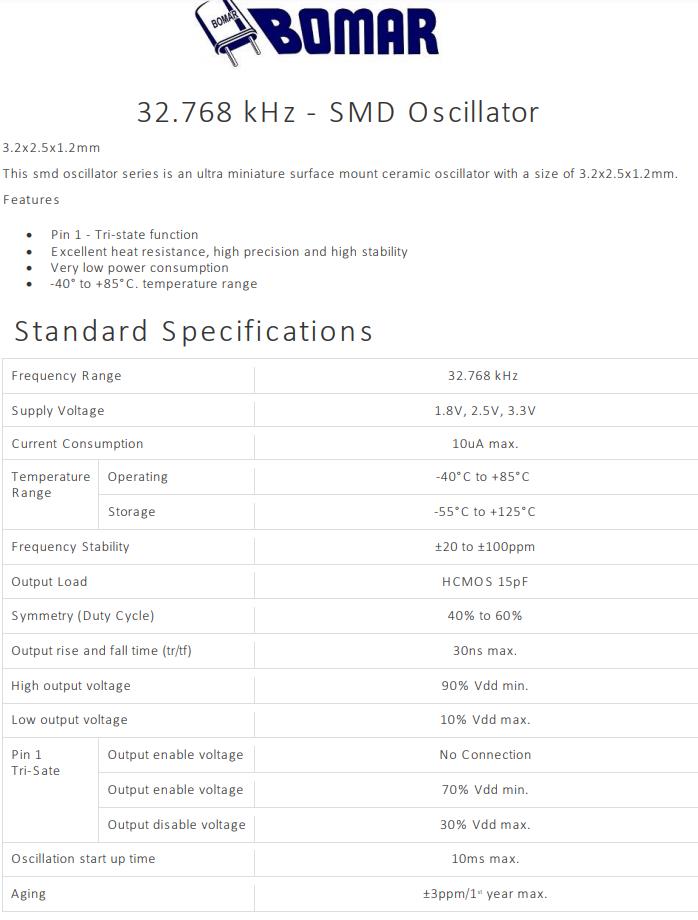 Bomar晶振,B1350-AEBS3T-32.768kHz晶振,高品質(zhì)晶振,小型SMD有源晶振,從最初超大體積到現(xiàn)在的7050mm,6035mm,5032mm,3225mm,2520mm體積,有著翻天覆地的改變,體積的變小也使產(chǎn)品帶來了更高的穩(wěn)定性能,接縫密封石英晶體振蕩器,精度高,覆蓋頻率范圍寬的特點,SMD高速自動安裝和高溫回流焊設(shè)計,Optionable待機輸出三態(tài)輸出功能,電源電壓范圍:1.8V~5V,高穩(wěn)定性,低抖動,低功耗,主要應(yīng)用領(lǐng)域:無線通訊,高端智能手機,平板筆記本W(wǎng)LAN,藍牙,數(shù)碼相機,DSL和其他IT產(chǎn)品的晶振應(yīng)用,三態(tài)功能,PC和LCDM等高端數(shù)碼領(lǐng)域,符合RoHS/無鉛.Bomar成立于 1963 年,是一家為商業(yè)和雙向無線電行業(yè)生產(chǎn)石英晶體的制造商。該業(yè)務(wù)的性質(zhì)要求在寬頻率范圍內(nèi)具有嚴(yán)格的容差和高穩(wěn)定性晶體,以滿足嚴(yán)格的 FCC 規(guī)范。快速生產(chǎn)的需求對我們不斷增長的客戶群很重要。我們的許多客戶都是當(dāng)?shù)亍⒅莺吐?lián)邦警察和監(jiān)視機構(gòu)。Bomar 很快不僅成為該市場的領(lǐng)先供應(yīng)商,而且因其產(chǎn)品質(zhì)量、快速周轉(zhuǎn)時間和無與倫比的客戶服務(wù)而獲得一致認(rèn)可。