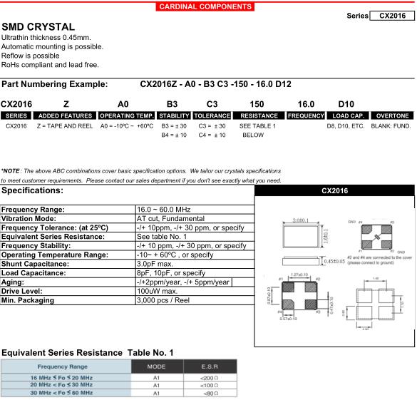 Cardinal晶振,CX2016晶振,CX2016Z-A0-B3C3-150-16.0D12晶振