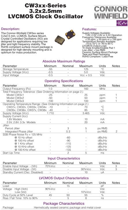 康納溫菲爾德晶振,CW36晶振,CW333-020.000M晶振,小型SMD有源晶振,從最初超大體積到現在的7050mm,6035mm,5032mm,3225mm,2520mm體積,有著翻天覆地的改變,體積的變小也使產品帶來了更高的穩定性能,接縫密封石英晶體振蕩器,精度高,覆蓋頻率范圍寬的特點,SMD高速自動安裝和高溫回流焊設計,Optionable待機輸出三態輸出功能,電源電壓范圍:1.8V~5V,高穩定性,低抖動,低功耗,主要應用領域:無線通訊,高端智能手機,平板筆記本WLAN,藍牙,數碼相機,DSL和其他IT產品的晶振應用,三態功能,PC和LCDM等高端數碼領域,符合RoHS/無鉛.Connor-Winfield Corporation 是一家私人控股的美國電子產品制造商。1963 年成立后,Connor-Winfield 主要專注于設計和制造用于各種電子應用的石英計時電路和振蕩器。在 1990 年代,Connor-Winfield 擴展到其他產品領域,同時繼續關注其核心計時根源。