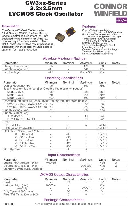 ConnorWinfield晶振,CW38晶振,CW333-016.000M晶振,小型SMD有源晶振,從最初超大體積到現(xiàn)在的7050mm,6035mm,5032mm,3225mm,2520mm體積,有著翻天覆地的改變,體積的變小也使產(chǎn)品帶來了更高的穩(wěn)定性能,接縫密封石英晶體振蕩器,精度高,覆蓋頻率范圍寬的特點(diǎn),SMD高速自動(dòng)安裝和高溫回流焊設(shè)計(jì),Optionable待機(jī)輸出三態(tài)輸出功能,電源電壓范圍:1.8V~5V,高穩(wěn)定性,低抖動(dòng),低功耗,主要應(yīng)用領(lǐng)域:無線通訊,高端智能手機(jī),平板筆記本W(wǎng)LAN,藍(lán)牙,數(shù)碼相機(jī),DSL和其他IT產(chǎn)品的晶振應(yīng)用,三態(tài)功能,PC和LCDM等高端數(shù)碼領(lǐng)域,符合RoHS/無鉛.
