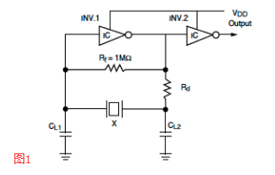 使用逆變器門將數(shù)字IC配置成振蕩電路變得越來越普遍.下頁的圖1顯示了帶CMOS反相器的基本振蕩電路的配置.INV.1用作振蕩電路的反相放大器.INV.2用作波形整形器,并且還用作輸出的緩沖器.反饋電阻Rf在逆變器周圍提供負(fù)反饋,以便在通電時(shí)振蕩開始.如果Rf的值太大而輸入逆變器的絕緣電阻太低,則由于環(huán)路增益的損失,振蕩將停止.而且,如果Rf太大,則可以將來自其他電路的噪聲引入振蕩電路.顯然,如果1M的Rf通常與石英晶體諧振器一起使用.阻尼電阻Rd具有以下功能,但有時(shí)省略.它使逆變器和反饋電路之間的耦合松動(dòng),從而減小逆變器輸出側(cè)的負(fù)載.此外,反饋電路的相位穩(wěn)定.它還提供了一種降低較高頻率增益的方法,從而防止了寄生振蕩的可能性.