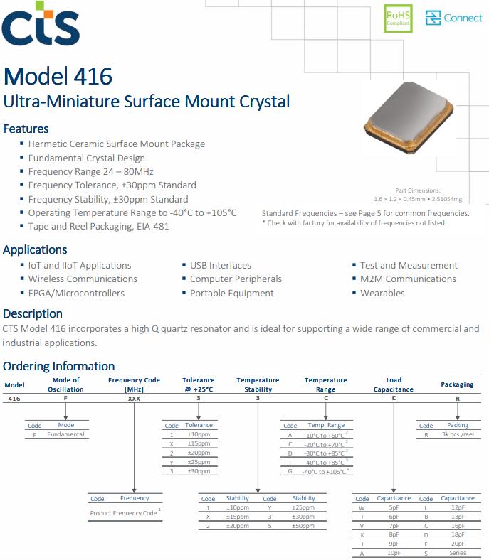 | 416F52012ADR | CTS晶振 | 416 | MHz Crystal | 52MHz |