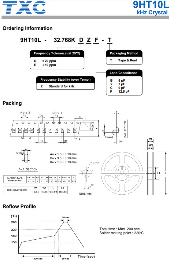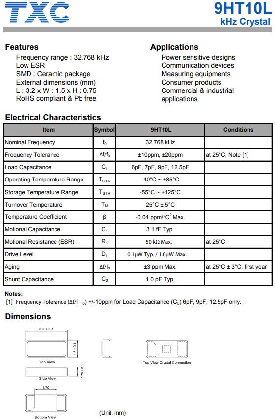 臺灣晶技TXC晶振為專業生產制造頻率控制電子元器件供應商,其生產的產品9HT10L系列,編碼9HT10L-32.768KDZF-T,石英晶體諧振器,頻率32.768k,SMD陶瓷封裝,低ESR,兩腳貼片晶振,小體積晶振尺寸:3.2x1.5x0.75mm,符合RoHS標準,無鉛。 應用于:功耗敏感型設計,通信設備,測量設備,消費品,商業和工業,應用程序。