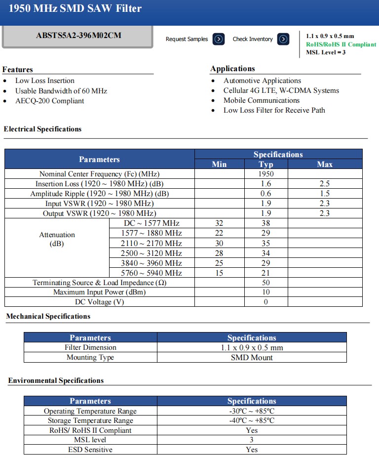 更多>>用于接收路徑的低損耗濾波器ABSTS5A2-396M02CM