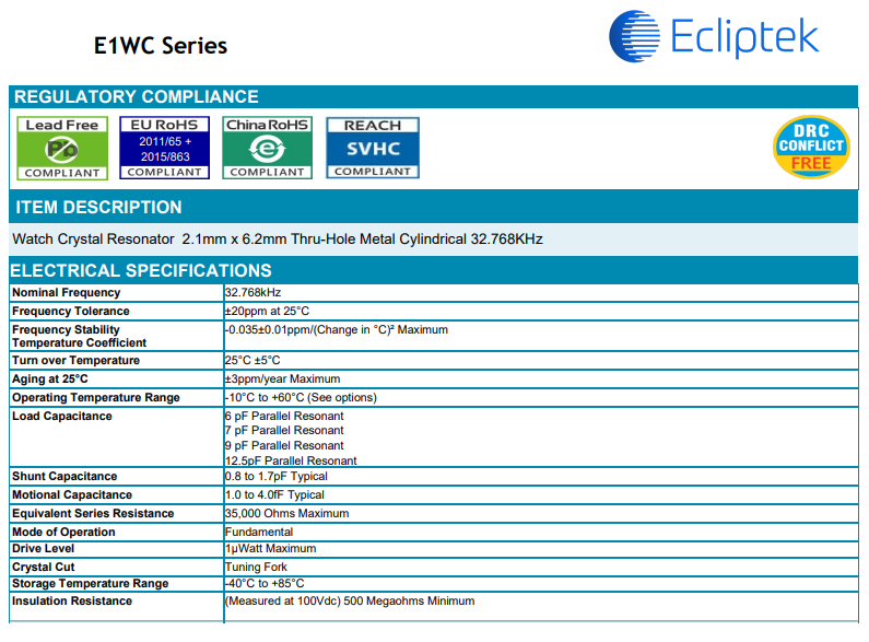 | E1WCDA12-32.768K | Ecliptek晶振 | CRYSTAL 32.7680KHZ 12.5PF TH | 35 kOhms | -10°C ~ 60°C |