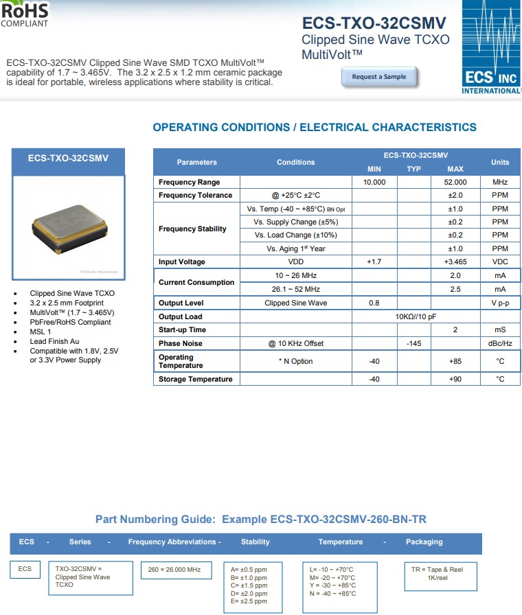ECS溫補晶振ECS-TXO-32CSMV MultiVolt削波正弦波緊密穩定TCXO允許客戶將同一設備用于多種設計。溫補晶體振蕩器具有多電壓特性,在-40°C~+85°C溫度范圍內提供0.5ppm的超精密頻率穩定度選項。這使得用戶可以將同一器件用于多種設計,從而降低認證要求和庫存。CSMV系列在-40°C~+85°C溫度范圍內的0.5 ppm穩定性,容量為1.7V~3.465V,小體積晶振采用3.2×2.5×1.2毫米陶瓷封裝四腳貼片晶振,ECS-TXO-32CSMV-200-EN-TR為精密應用的經濟高效的解決方案,非常適合穩定性至關重要的便攜式無線應用。
