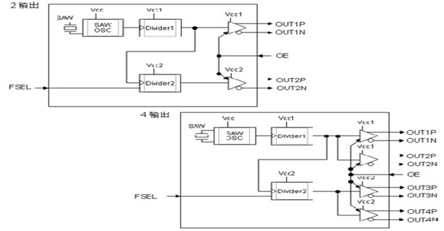 此款產(chǎn)品與原先SAW振蕩器完全不同,因?yàn)閮?nèi)建了扇出緩沖※3,從而實(shí)現(xiàn)了2個(gè)或4個(gè)時(shí)鐘同時(shí)輸出※4的一體化封裝.在內(nèi)建扇出緩沖的基礎(chǔ)上實(shí)現(xiàn)了低抖動(dòng)特性.因此,大大減少了需要多個(gè)時(shí)鐘源的用戶處理系統(tǒng)的產(chǎn)品部件數(shù)量,低耗電節(jié)省了安裝面積為電子行業(yè)做出了巨大貢獻(xiàn).
