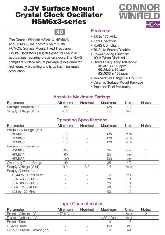 | HSM613-050.0M | 康納溫菲爾德時鐘振蕩器 | HSM6 | 50MHz | -40°C ~ 85°C |