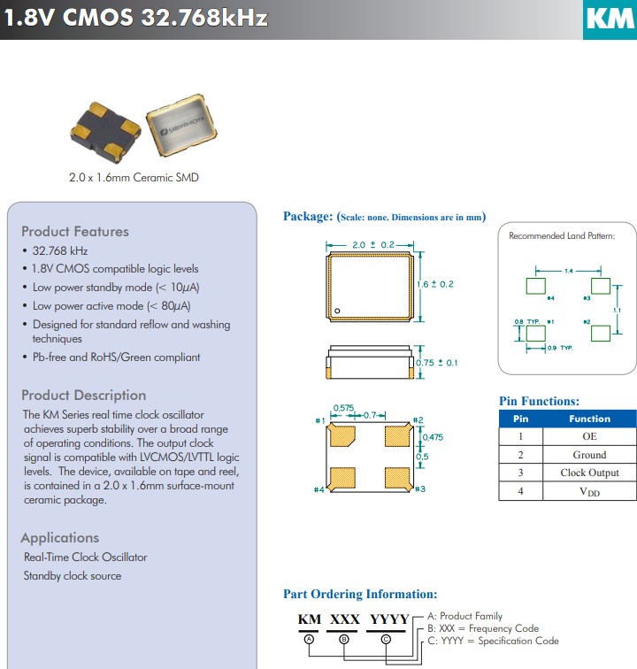 亞陶晶振KM系列1.8V,KM3270002,實(shí)時(shí)時(shí)鐘晶體振蕩器在廣泛的工作條件下實(shí)現(xiàn)了卓越的穩(wěn)定性,頻率32.768kHz,CMOS晶體振蕩器,輸出時(shí)鐘信號(hào)與 LVCMOS/LVTTL邏輯電平兼容,四腳貼片晶振,該器件采用卷帶包裝,小體積晶振尺寸采用2.0x1.6mm表面貼裝陶瓷封裝。