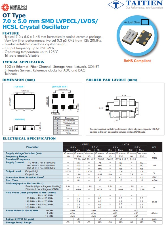 Taitien的OT-M和OW-M系列超低抖動非常適合高速網絡應用,OTETGCLTNF-156.250000,LVPECL差分晶振