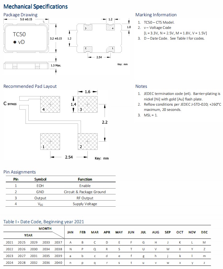 32.768K振蕩器TC50V5C32K7680具有低相位抖動性能的實時時鐘參考,CTS晶振型號TC50,是一款小尺寸5.0x3.2x1.3mm封裝,四腳貼片晶振,有源晶振,石英晶體振蕩器,HCMOS時鐘振蕩器[XO],頻率32.768kHz,TC50采用了提供低電流消耗的IC技術,提供了一個具有優異的穩定性和低相位抖動性能的實時時鐘參考。