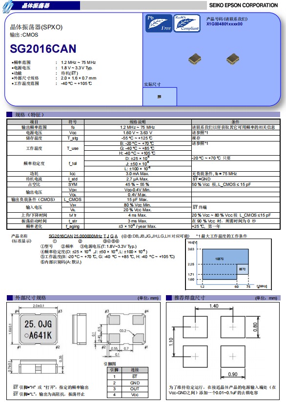 日本進口愛普生晶振SG2016CAN,是一款小體積晶振尺寸2.0x1.6mm石英晶體振蕩器(SPXO),支持CMOS輸出電平,四腳貼片晶振,有源晶振,1.6V至3.63V的寬工作電壓和寬工作溫度范圍從-40℃到85℃,此外,最高工作溫度可達105℃。 具有超小型,輕薄型,低抖動,低功耗,低損耗,低耗能,低電流消耗等特點,非常適合物聯網、可穿戴設備、醫療、工業自動化等各種應用。