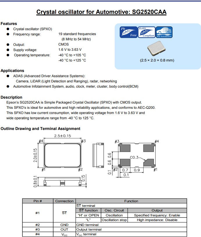 愛普生晶振SG2520CAA是具有CMOS輸出的簡單封裝石英晶體振蕩器(SPXO)。 小體積晶振尺寸2.5x2.0mm四腳貼片晶振,這款SPXO非常適合汽車和高可靠性應用,符合AEC-Q200標準。 該SPXO具有低功耗、1.6V至3.63V的寬工作電壓以及40°C至85°C的寬工作溫度范圍,此外還可提供高達125°C的工作溫度,輸出頻率范圍在8MHz至54MHz,該產品具有超小型,輕薄型,低電壓晶振,高精度,高性能,高品質等特點,適用于ADAS(高級駕駛輔助系統): 攝像頭、激光雷達(光探測和測距)、雷達、網絡 ,汽車信息娛樂系統、音頻、時鐘、儀表、組合儀表、車身控制(BCM)等。