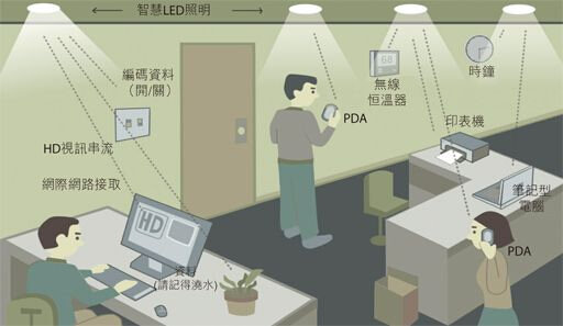 光和無線電波一樣,都是屬于電磁波的一種,傳播網絡信號的基本原理是一致的,給普通的LED燈泡裝上微芯片,可以控制它每秒數百萬次閃爍,亮了表示1,滅了表示0,其頻率太快,根本察覺不到,漲敏傳感器卻可以接收到這些變化,就這樣,二進制的數據就快速編碼成燈光信號并進行了有效的傳輸,燈光下的電腦通過一套特制的接收裝置,讀懂燈光里的”莫爾斯密碼”.”有燈光的地方就有網絡信號,關掉燈,網絡全無”,與現有的WIFI相比,未來的可見光通訊安全又經濟.WIFI依然看不見的無線電波傳輸,設備功率越來越大,局部電磁輻射增強;無線信號穿墻而過,網絡信息不安全,這些安全隱患在可見光通訊中一掃而光”,且光譜比無線電頻譜大10000倍,意味著更大的帶寬和更高的速度,網絡設置幾乎不需要任何新的基礎設施.