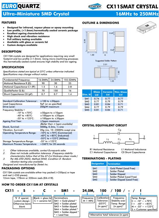Euroquartz晶振,CX11SMAT晶振,CX11-S-C-SM1-24.0M,100/100/I晶振
