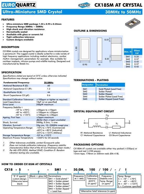 Euroquartz晶振,CX18SMAT晶振,CX18-S-SM1-50.0M,100/100/I晶振,Euroquartz Limited是一家獨立的,以英國為基地的全球電子制造行業石英晶體,振蕩器,濾波器和頻率相關產品的制造商和供應商。