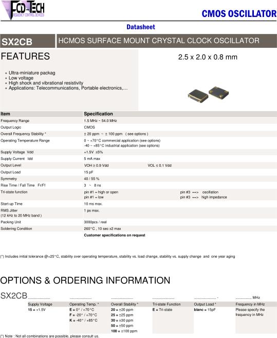 FCD-Tech晶振,SX2CB晶振,SX2CB-15K25E15pF-16.000MHz晶振,有源晶振,是指晶體本身起振需要外部電壓供應(yīng),起振后可直接驅(qū)動(dòng)CMOS集成電路,產(chǎn)品本身已實(shí)現(xiàn)與薄型IC(TSSOP封裝,TVSOP封裝)同樣的1mm厚度,斷開時(shí)的消費(fèi)電流是15µA以下,編帶包裝方式可對(duì)應(yīng)自動(dòng)搭載及IR回流焊接(無鉛對(duì)應(yīng))產(chǎn)品有幾種電壓供選1.8V,2.5V,3V3.3V,5V,以應(yīng)對(duì)不同IC產(chǎn)品需要.