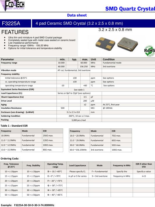 FCD-Tech晶振,F3225A晶振,F3225A-3050D303-24.000MHz晶振,超小型表面貼片型SMD晶振,最適合使用在汽車電子領(lǐng)域中,也是特別要求高可靠性的引擎控制用CPU的時(shí)鐘部分.低頻晶振可從7.98MHz起對(duì)應(yīng),小型,超薄型具備強(qiáng)防焊裂性,石英晶體在極端嚴(yán)酷的環(huán)境條件下也能發(fā)揮穩(wěn)定的起振特性,產(chǎn)品本身具有耐熱,耐振,耐撞擊等優(yōu)良的耐環(huán)境特性,滿足無鉛焊接以及高溫回流溫度曲線要求,符合AEC-Q200標(biāo)準(zhǔn).