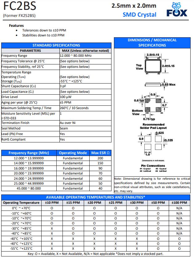 | FX252BS-20.000 | FOX晶振 | FX252B | MHz Crystal | 20MHz | ±50ppm |