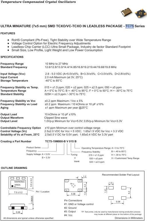 Fortiming晶振,TC75晶振,TC75-19M800-BV016B晶振,溫補晶振(TCXO)產品本身具有溫度補償作用,高低溫度穩定性:頻率精度高0.5PPM-2.0PPM,工作溫度范圍:-30度至85度,電源電壓:1.8V-3.3V之間可供選擇,產品本身具有溫度電壓控制功能,世界上最薄的晶振封裝,頻率:26兆赫,33.6兆赫,38.4兆赫,40兆赫,因產品性能穩定,精度高等優勢,被廣泛應用到一些比較高端的數碼通訊產品領域,GPS全球定位系統,智能手機,WiMAX和蜂窩和無線通信等產品,符合RoHS/無鉛.