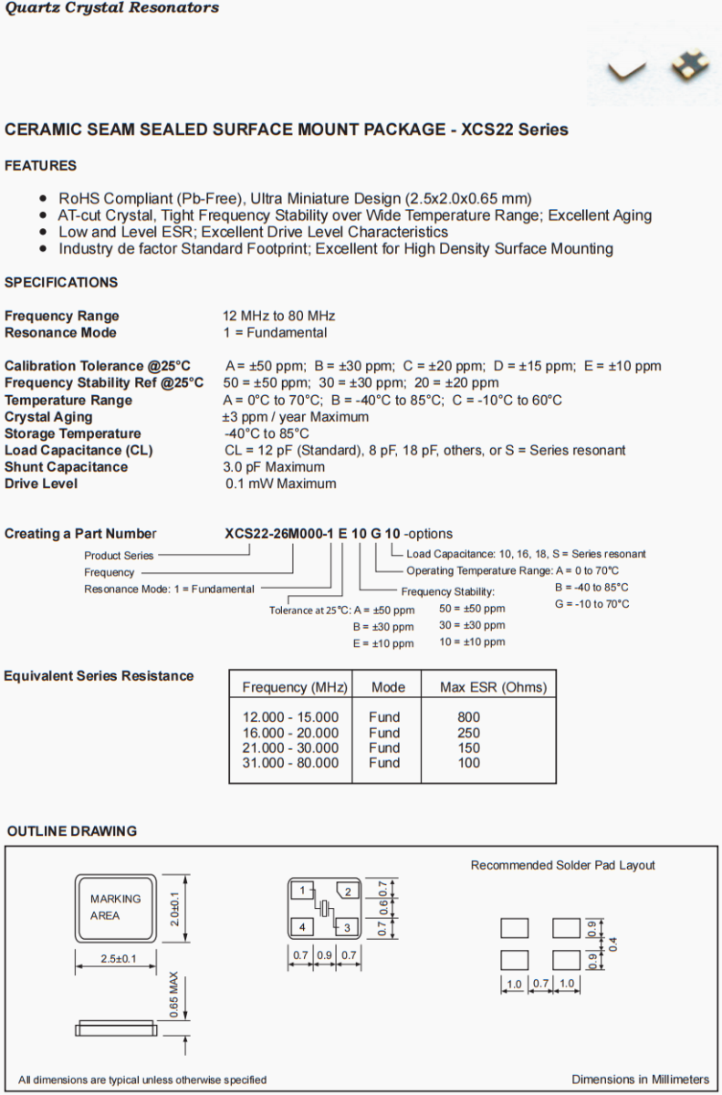 高品質(zhì)富通晶振,智能輔助駕駛晶振,XCS22-12M288-1E20G10晶振,美國Fortiming晶振公司,歐美晶振,富通晶振,石英晶振,貼片晶振,小體積晶振,高品質(zhì)晶振,低損耗晶振,耐高溫晶振,進(jìn)口晶振,無源晶振,四腳晶振,汽車晶振,多功能方向盤晶振,無人機(jī)晶振,6G通訊設(shè)備晶振,陶瓷SEAM密封表面安裝包- XCS22系列具有RoHS兼容(無鉛),超微型設(shè)計(jì)(2.5x2.0x0.65 mm)切割晶體,在寬溫度范圍內(nèi)的頻率穩(wěn)定性;優(yōu)良的低老化水平和水平ESR;優(yōu)秀的驅(qū)動(dòng)水平特性行業(yè)因素標(biāo)準(zhǔn)足跡;適用于高密度表面安裝