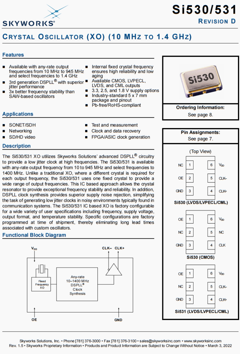 | 530BC187M500DG | Skyworks晶振 | Si530 | 187.5 MHz | LVDS | 3.3V | ±7ppm |