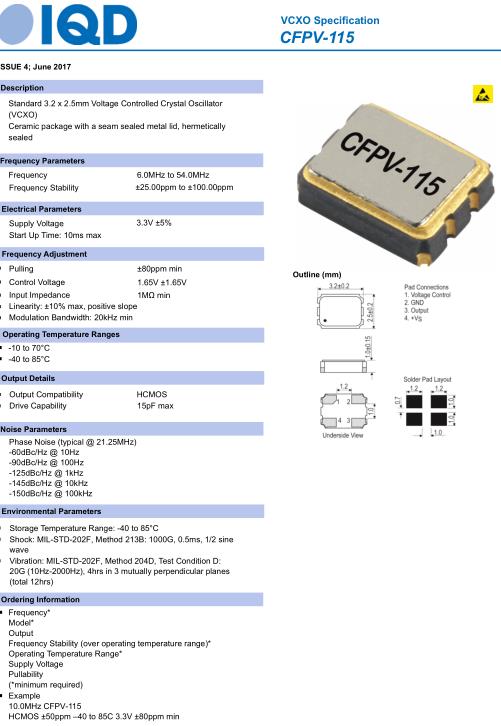 IQD晶振,CFPV-115晶振,10.0MHz-CFPV-115晶振,壓控晶振(VCXO),壓控石英晶體振蕩器基本解決方案,PECL輸出,輸出頻率60MHz到200MHz之間,出色的低相位噪聲和抖動,三態功能,應用:SDH/SONET,以太網,基站,筆記本晶振應用,符合RoHS/無鉛.IQD伊克德晶振集團有超過40年的生產頻率元件產品經驗,在頻率控制市場上,IQD是公認的市場領導者.擁有60多個國家的活躍客戶,伊克德提供了最全面的晶振晶體頻率范圍,從低成本的商業級產品到高可靠性工業、汽車和軍事等級的應用,包括:晶振,石英貼片晶振,水晶振蕩子,晶體振蕩器,壓控溫補晶振,石英晶體諧振器等.