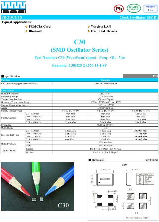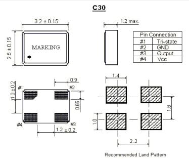 ITTI晶振,C30晶振,C30H25-24.576-15-1.8V晶振,小型SMD有源晶振,從最初超大體積到現在的7050mm,6035mm,5032mm,3225mm,2520mm體積,有著翻天覆地的改變,體積的變小也使產品帶來了更高的穩定性能,接縫密封石英晶體振蕩器,精度高,覆蓋頻率范圍寬的特點,SMD高速自動安裝和高溫回流焊設計,Optionable待機輸出三態輸出功能,電源電壓范圍:1.8V~5V,高穩定性,低抖動,低功耗,主要應用領域:無線通訊,高端智能手機,平板筆記本WLAN,藍牙,數碼相機,DSL和其他IT產品的晶振應用,三態功能,PC和LCDM等高端數碼領域,符合RoHS/無鉛.