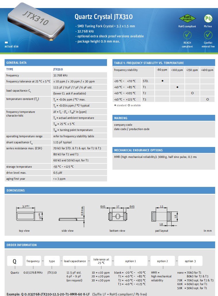 法國進口晶振,Jauch晶振,型號:JTX310系列,編碼為:Q 0.032768-JTX310-7-20-T2-HMR-LF,頻率:32.768K,負載電容:7pF,頻率公差:±20ppm,工作溫度范圍:-40℃至+105℃,小體積晶振尺寸:3.2x1.5x0.9mm封裝,兩腳貼片晶振,音叉晶體,3215晶振,無源晶體,石英晶振,石英晶體諧振器,SMD晶振。具有輕薄型晶振,超小型晶振,高品質晶振,高質量晶振,耐熱及耐環境特點。被廣泛應用于:實時時鐘晶振,汽車電子晶振,數字顯示晶振,智能儀表晶振,通信設備等應用。