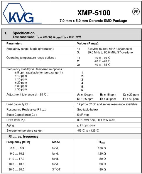 | KVG晶振規格 | 單位 | XMP-5100晶振頻率范圍 | 石英晶振基本條件 |