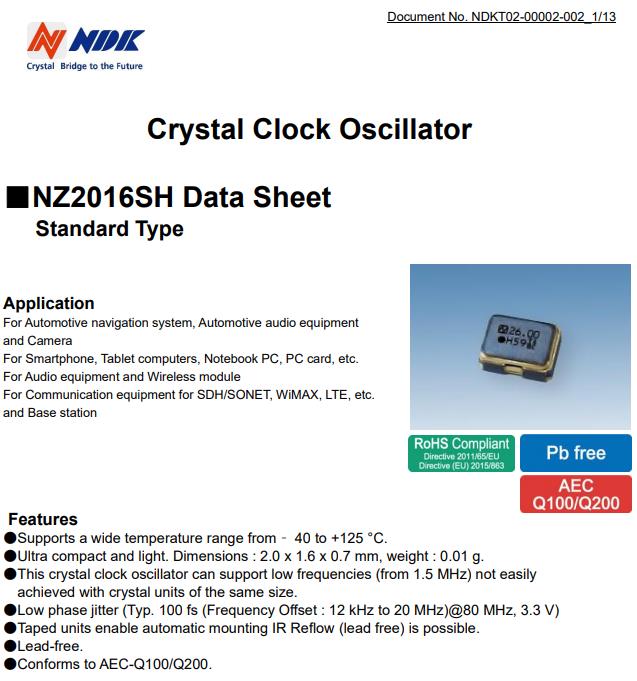 NZ2016SH-24.000MHZNSC5022C貼片振蕩器,NDK車載有源晶振NZ2016SH,是一款高質(zhì)量低電壓的SPXO振蕩器,特征 :支持–40至+125°c的寬溫度范圍 ,超緊湊和輕便。尺寸:2.0 x 1.6 x 0.7毫米,重量:0.01克 ,這種晶體時鐘振蕩器不容易支持低頻(從1.5MHz開始) 用相同尺寸的晶體單元實現(xiàn)。 低相位抖動(典型值。100fs(頻率偏移:12kHz至20MHz)(80MHz,3.3V) ,膠帶裝置可實現(xiàn)自動安裝,IR回流(無鉛)是可能的。 無鉛。 符合AEC-Q100/Q200。產(chǎn)品用于汽車導(dǎo)航系統(tǒng)、汽車音響設(shè)備和照相機 用于智能手機、平板電腦、筆記本電腦、PC卡等。 用于音頻設(shè)備和無線模塊,適用于SDH/SONET、WiMAX、LTE等通信設(shè)備,基站.NZ2016SH-24.000MHZNSC5022C貼片振蕩器,NDK車載有源晶振NZ2016SH.