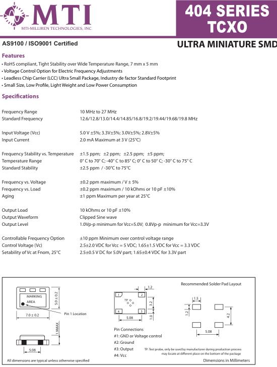 MTI晶振,404晶振,TCXO振蕩器,溫補晶振(TCXO)產品本身具有溫度補償作用,高低溫度穩(wěn)定性:頻率精度高0.5PPM-2.0PPM,工作溫度范圍:-30度至85度,電源電壓:1.8V~3.3V之間可供選擇,產品本身具有溫度電壓控制功能,世界上最薄的晶振封裝,頻率:26兆赫,33.6兆赫,38.4兆赫,40兆赫,因產品性能穩(wěn)定,精度高等優(yōu)勢,被廣泛應用到一些比較高端的數碼通訊產品領域,GPS全球定位系統,智能手機,WiMAX和蜂窩和無線通信等產品,符合RoHS/無鉛.