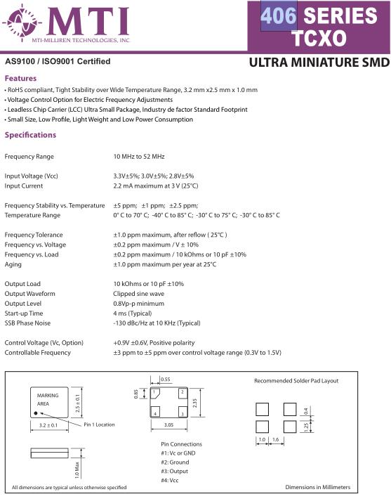MTI晶振,406晶振,溫補晶振,小型SMD有源晶振,從最初超大體積到現在的7050mm,6035mm,5032mm,3225mm,2520mm體積,有著翻天覆地的改變,體積的變小也使產品帶來了更高的穩定性能,接縫密封石英晶體振蕩器,精度高,覆蓋頻率范圍寬的特點,SMD高速自動安裝和高溫回流焊設計,Optionable待機輸出三態輸出功能,電源電壓范圍:1.8V?5V,高穩定性,低抖動,低功耗,主要應用領域:無線通訊,高端智能手機,平板筆記本WLAN,藍牙,數碼相機,DSL和其他IT產品的晶振應用,三態功能,PC和LCDM等高端數碼領域,符合RoHS/無鉛.“MTI的使命是通過創新設計,領先的制造技術和提供世界一流的客戶服務,重新定義頻率控制產品的市場。我們相信與客戶,供應商和員工的合作將帶來最高可靠性和質量的產品。”