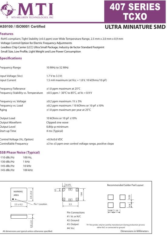 MTI晶振,407晶振,TCXO溫補晶振,有源晶振,是指晶體本身起振需要外部電壓供應,起振后可直接驅動CMOS集成電路,產品本身已實現與薄型IC(TSSOP封裝,TVSOP封裝)同樣的1mm厚度,斷開時的消費電流是15µA以下,編帶包裝方式可對應自動搭載及IR回流焊接(無鉛對應)產品有幾種電壓供選1.8V,2.5V,3V3.3V,5V,以應對不同IC產品需要.