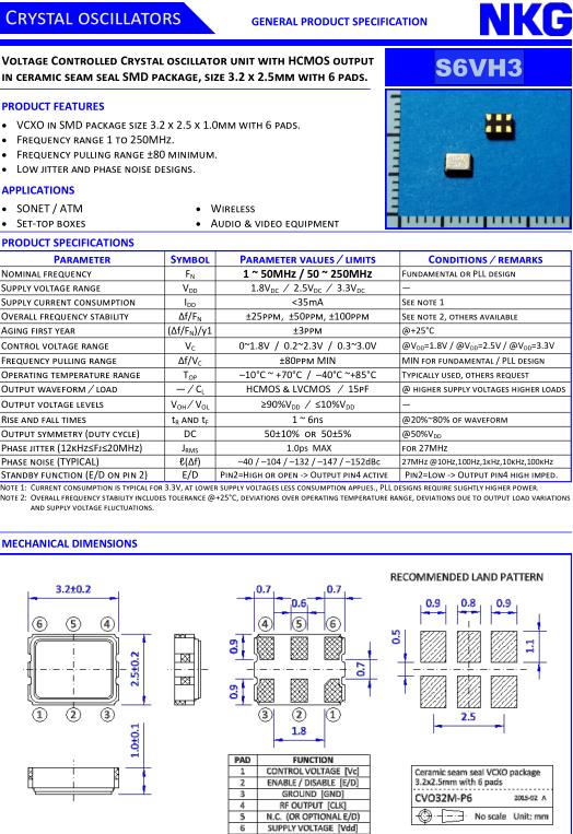 NJR晶振,S6VH3晶振,S6VH333B-20.000MT50A-EXT晶振,小型SMD有源晶振,從最初超大體積到現(xiàn)在的7050mm,6035mm,5032mm,3225mm,2520mm體積,有著翻天覆地的改變,體積的變小也使產(chǎn)品帶來了更高的穩(wěn)定性能,接縫密封石英晶體振蕩器,精度高,覆蓋頻率范圍寬的特點,SMD高速自動安裝和高溫回流焊設(shè)計,Optionable待機輸出三態(tài)輸出功能,電源電壓范圍:1.8V~5V,高穩(wěn)定性,低抖動,低功耗,主要應(yīng)用領(lǐng)域:無線通訊,高端智能手機,平板筆記本W(wǎng)LAN,藍牙,數(shù)碼相機,DSL和其他IT產(chǎn)品的晶振應(yīng)用,三態(tài)功能,PC和LCDM等高端數(shù)碼領(lǐng)域,符合RoHS/無鉛..