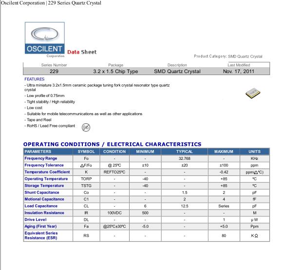 Oscilent晶振,229晶振,229-32.768K-SR-20-W-TR晶振