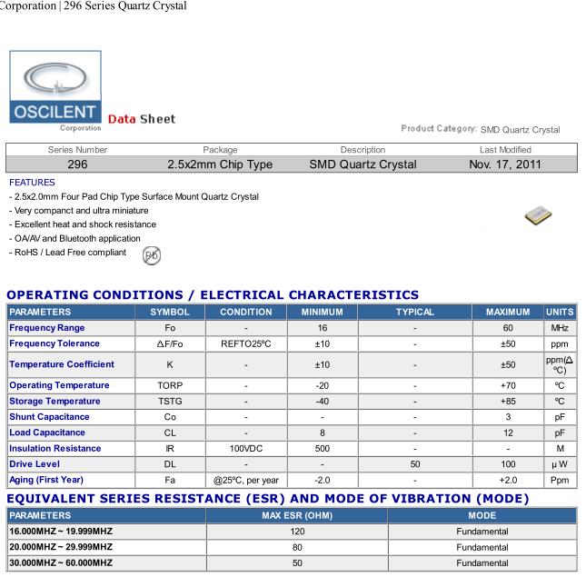 Oscilent晶振,296晶振,296-25.0M-9-20-G-S-TR晶振