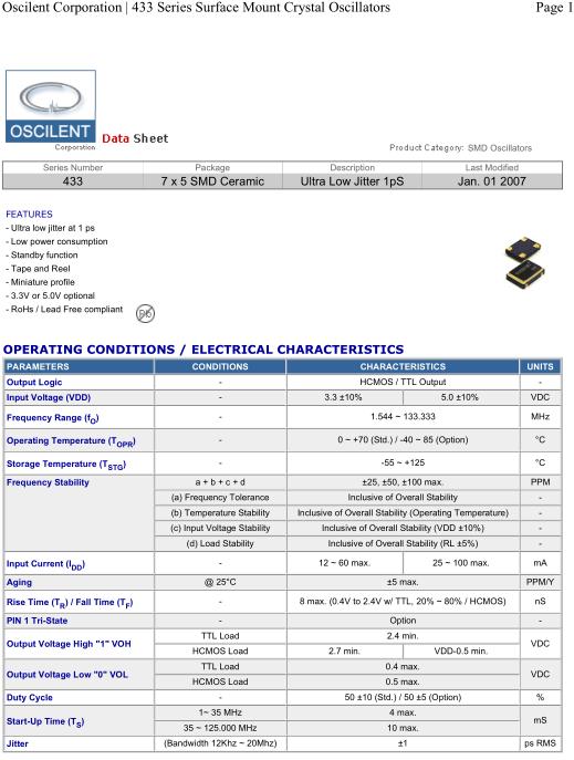 Oscilent晶振,433晶振,433-24.0M-3EN-T-TS晶振,小型SMD有源晶振,從最初超大體積到現(xiàn)在的7050mm,6035mm,5032mm,3225mm,2520mm體積,有著翻天覆地的改變,體積的變小也使產(chǎn)品帶來了更高的穩(wěn)定性能,接縫密封石英晶體振蕩器,精度高,覆蓋頻率范圍寬的特點(diǎn),SMD高速自動(dòng)安裝和高溫回流焊設(shè)計(jì),Optionable待機(jī)輸出三態(tài)輸出功能,電源電壓范圍:1.8V~5V,高穩(wěn)定性,低抖動(dòng),低功耗,主要應(yīng)用領(lǐng)域:無(wú)線通訊,高端智能手機(jī),平板筆記本W(wǎng)LAN,藍(lán)牙,數(shù)碼相機(jī),DSL和其他IT產(chǎn)品的晶振應(yīng)用,三態(tài)功能,PC和LCDM等高端數(shù)碼領(lǐng)域,符合RoHS/無(wú)鉛.Oscilent晶振公司發(fā)展歷程: