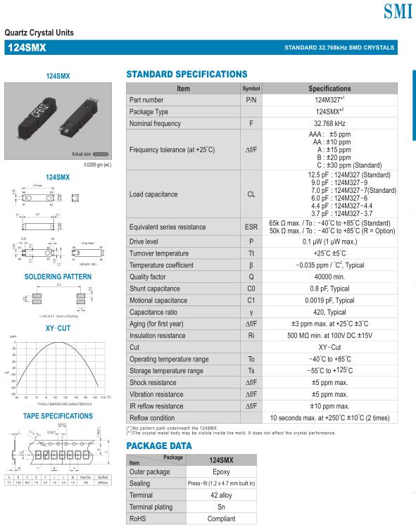 SMI晶振,124SMX晶振,7015mm無源晶振,32.768K時鐘晶體具有小型,薄型,輕型的貼片晶振表面音叉型晶體振蕩器,產品具有優良的耐熱性,耐環境特性,可發揮晶振優良的電氣特性,符合RoHS規定,滿足無鉛焊接的高溫回流溫度曲線要求,金屬外殼的封裝使得產品在封裝時能發揮比陶瓷振蕩器外殼更好的耐沖擊性..SMI是Crystal Technology的新興領導者。