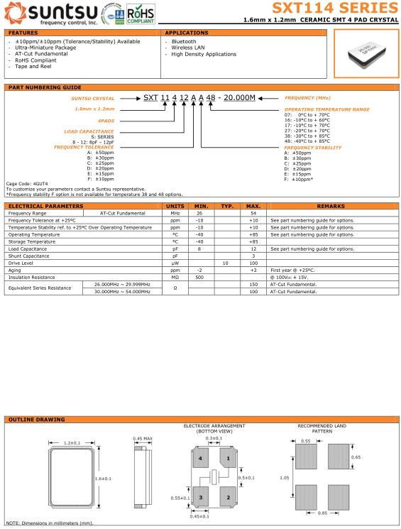 | Suntsu晶振規(guī)格 | 單位 | SXT114晶振頻率范圍 | 石英晶振基本條件 | |