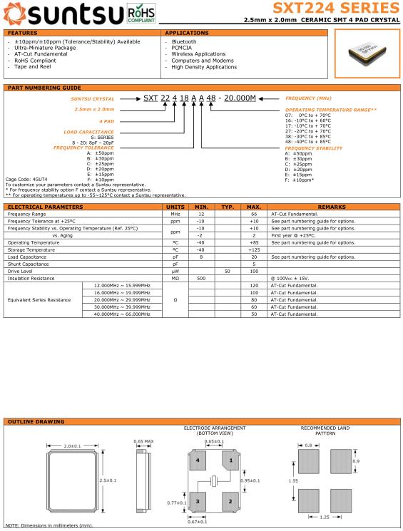 | Suntsu晶振規格 | 單位 | SXT224晶振頻率范圍 | 石英晶振基本條件 | |