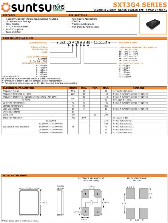 | Suntsu晶振規格 | 單位 | SXT3G4晶振頻率范圍 | 石英晶振基本條件 | |