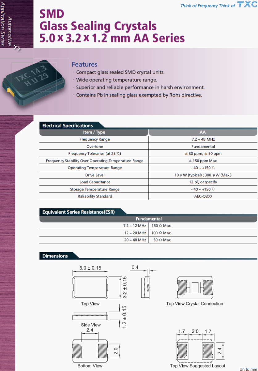 TXC陶瓷晶振,車載香薰系統(tǒng)晶振,AA-8.192MAGE-T二腳晶振,臺灣TXC晶振公司,晶技晶振,無源晶振,5032晶振,AA-8.192MAGE-T晶振,汽車晶振,汽車電動天窗控制系統(tǒng)晶振,臺灣晶振,貼片晶振,二腳晶振,石英晶振,高品質(zhì)晶振,車載多媒體晶振,行車記錄儀晶振,低損耗晶振,耐高溫晶振,耐沖擊晶振AA系列SMD,玻璃密封晶體,5.0 x 3.2 x 1.2 mm ,功能。緊湊的玻璃密封SMD晶體單元。工作溫度范圍廣。在惡劣環(huán)境下性能優(yōu)越可靠。不受Rohs指令限制的密封玻璃含鉛。