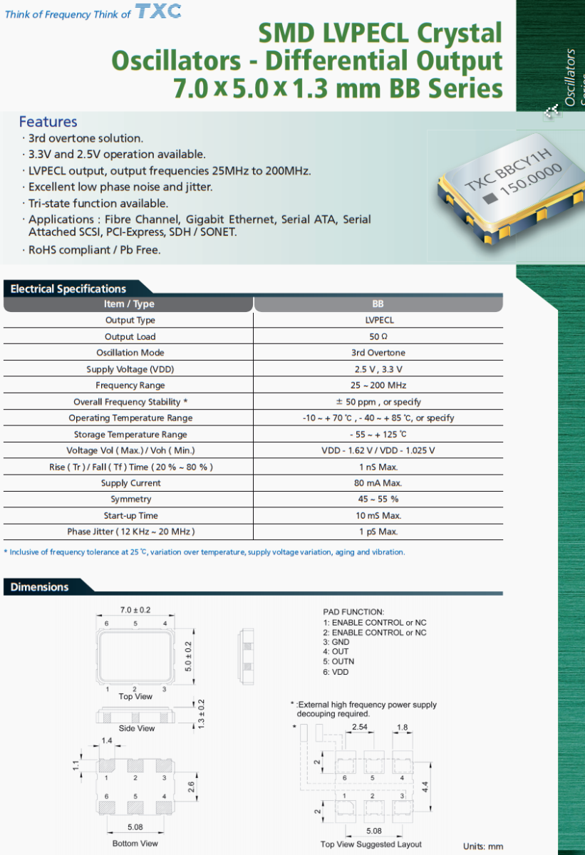| BB50070002 | TXC晶振 | BB | 50 MHz | LVPECL | 3.3V | ±50ppm |