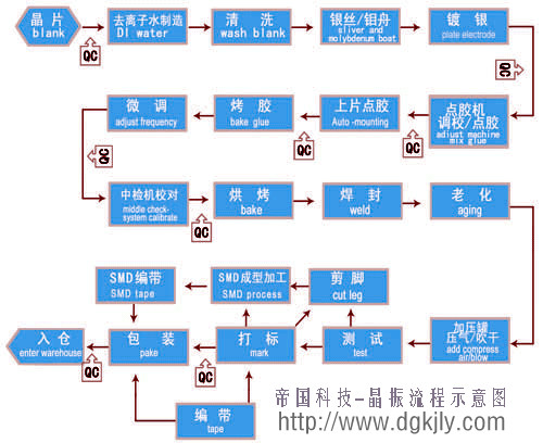 關(guān)于晶振,石英晶振,貼片晶振,32.768K,每天都在重復(fù)客戶和客戶講解著這些產(chǎn)品,原材料晶片到成品入庫,那么你知道在制作過程中有多少個程序嗎?有多少個環(huán)節(jié)是要QC檢驗的嗎?一起看看流程示意圖吧!